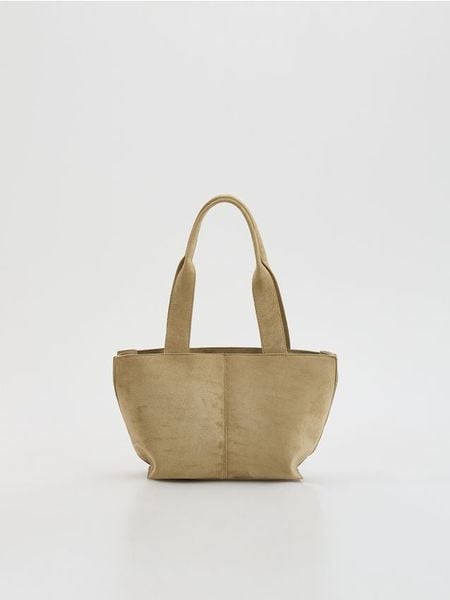 Torebka o trapezowej formie, wykonana z imitacji skóry.
