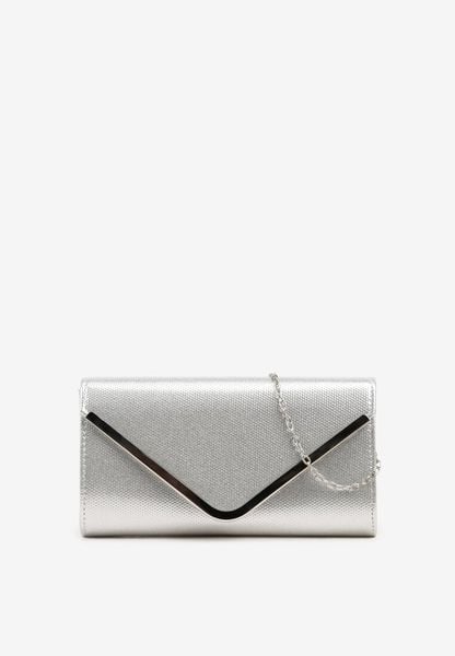 Srebrna Torebka Kopertówka z Łańcuszkiem Zdobiona Metaliczną Aplikacją Idalinna