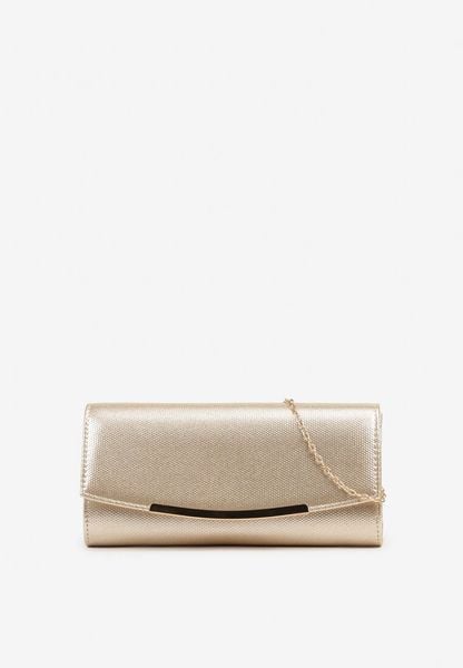 Złota Brokatowa Torebka Kopertówka z Łańcuszkiem i Metaliczną Aplikacją Pasliniela