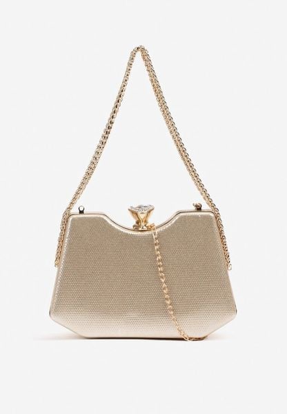 Złota Trapezowa Torebka Kopertówka z Połyskującego Materiału z Odpinanym Łańcuszkiem Geriora