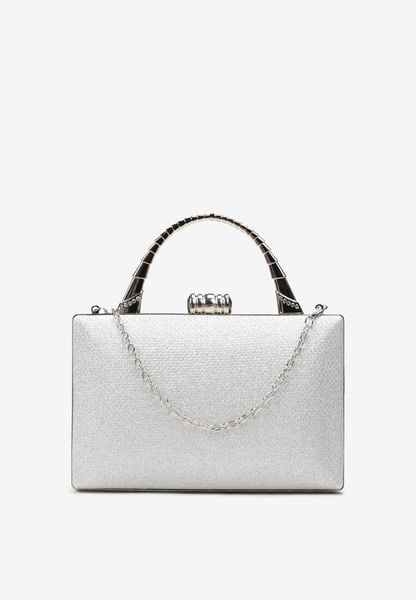 Srebrna Trapezowa Torebka Kopertówka z Połyskującego Materiału z Odpinanym Łańcuszkiem Geriora