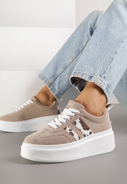 Ciemnobeżowe Sneakersy Klasyczne Tenisówki na Grubej Podeszwie z Koturnem i Paskami Ozdobionymi Printem w Łaty Adessia