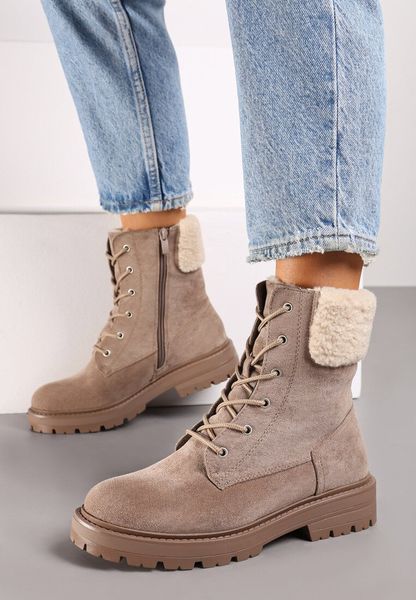 Beżowe Botki Typu Workery na Płaskiej Podeszwie z Barankowym Futerkiem przy Cholewce Nevathira