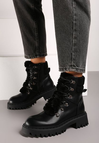 Czarne Sznurowane Traperki na Płaskiej Podeszwie Wyścielone Futerkiem Magsira