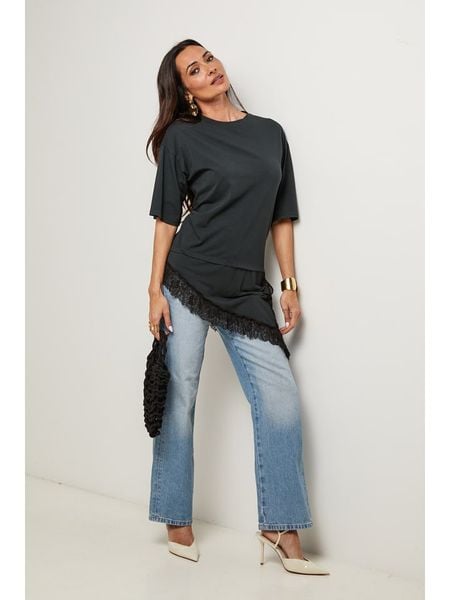 – czysta bawełna- dekolt: okrągły- długość rękawa: półdługi- dolny brzeg: asymetryczny- detale: frędzle- krój: luźny- look: jednokolorowy