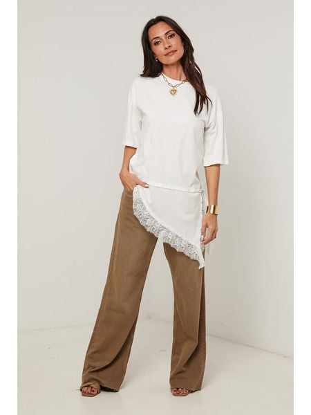 – czysta bawełna- dekolt: okrągły- długość rękawa: półdługi- dolny brzeg: asymetryczny- detale: frędzle- krój: luźny- look: jednokolorowy