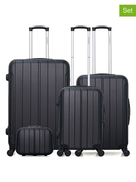 W zestawie:- 3 walizki w różnych rozmiarach- 1 kosmetyczkaWalizka:- materiał: tworzywo sztuczne- uchwyt: wyciągany- zapięcie: suwak- pasy do przypinania zawartości: tak- uchwyty: 2- kółka: 4, 360° kąt obracania- rodzaj kłódki: szyfrowa- kieszenie wewnętrzne: różne- najmniejsza walizka nadaje się jako bagaż podręcznyKosmetyczka:- materiał: tworzywo sztuczne- zapięcie: suwak- uchwyty: 1