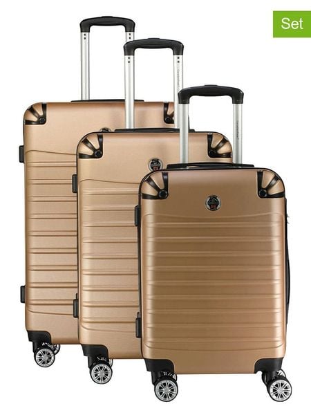 W zestawie:- 3 walizki w różnych rozmiarachWalizki:- materiał: ABS- uchwyty: 2- uchwyt: płynnie regulowany, teleskopowy- zapięcie: suwak- rodzaj kłódki: szyfrowa- pasy do przypinania zawartości: tak- kółka: 4, 360° kąt obracania