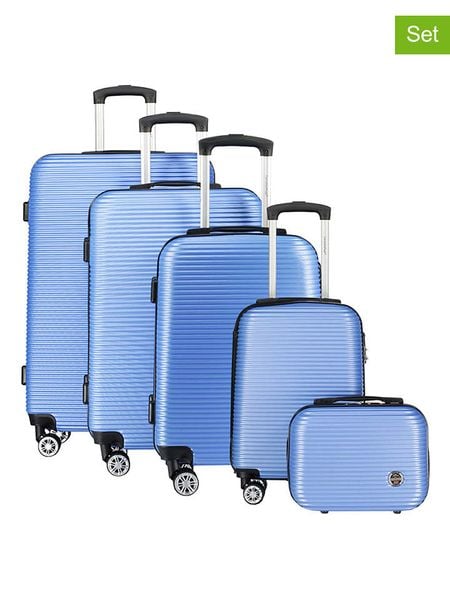 W zestawie:- 4 walizki w różnych rozmiarach- 1 kosmetyczkaWalizki:- materiał: ABS- uchwyty: 2- uchwyt: płynnie regulowany, teleskopowy- zapięcie: suwak- rodzaj kłódki: szyfrowa- pasy do przypinania zawartości: tak- kółka: 4, 360° kąt obracania- najmniejsza walizka nadaje się jako bagaż podręcznyKosmetyczka:- materiał: ABS- uchwyty: 1- zapięcie: suwak- detale: nóżki z tworzywa sztucznego