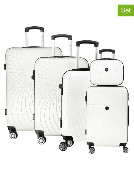W zestawie:- 4 walizki w różnych rozmiarach- 1 kosmetyczkaWalizki:- materiał: ABS- uchwyty: 2- uchwyt: płynnie regulowany, teleskopowy- zapięcie: suwak- rodzaj kłódki: szyfrowa- pasy do przypinania zawartości: tak- kółka: 4, 360° kąt obracania- najmniejsza walizka nadaje się na bagaż podręcznyKosmetyczka:- materiał: ABS- uchwyty: 1- zapięcie: suwak- rodzaj kłódki: szyfrowa- detale: nóżki z tworzywa sztucznego